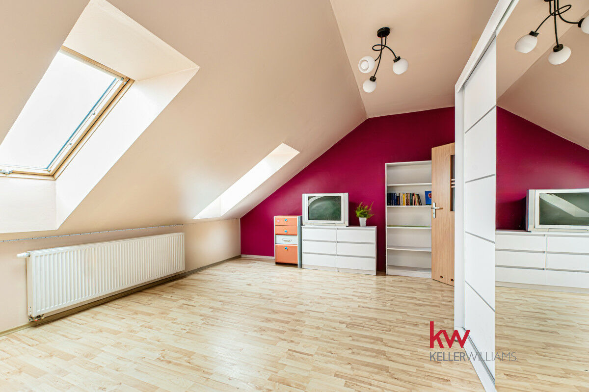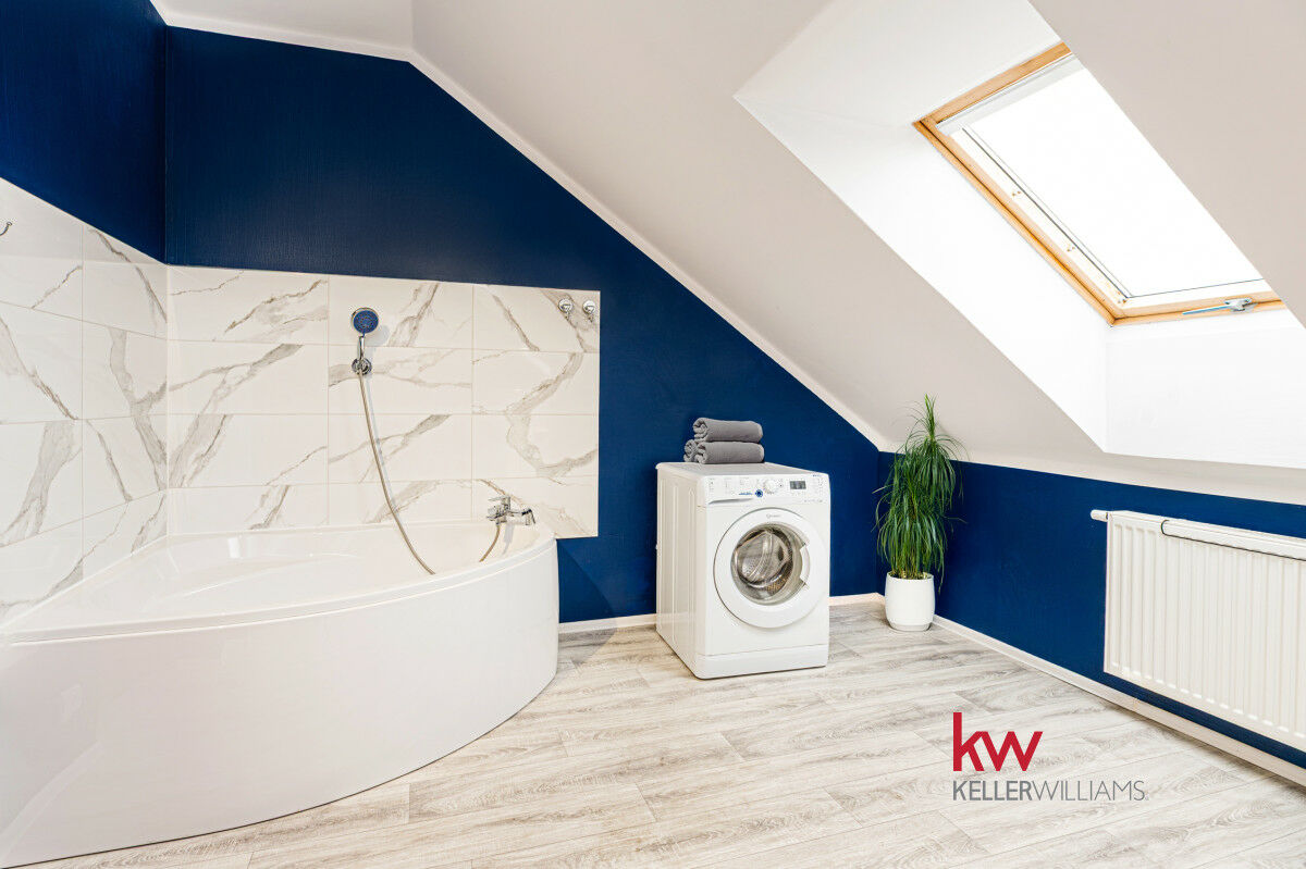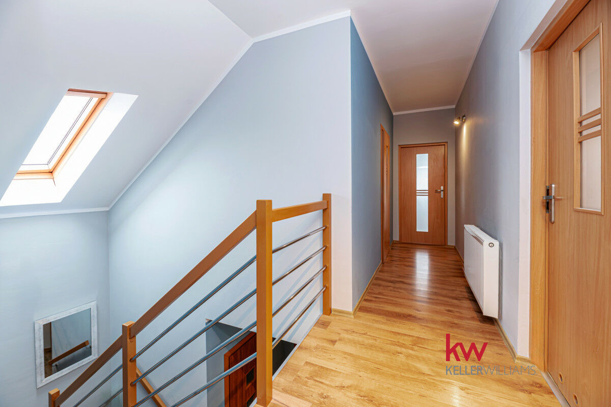 Piętro: 3 duże, ustawne sypialnie w jasnych kolorach, przestronna łazienka z narożną wanną i miejscem na pralkę